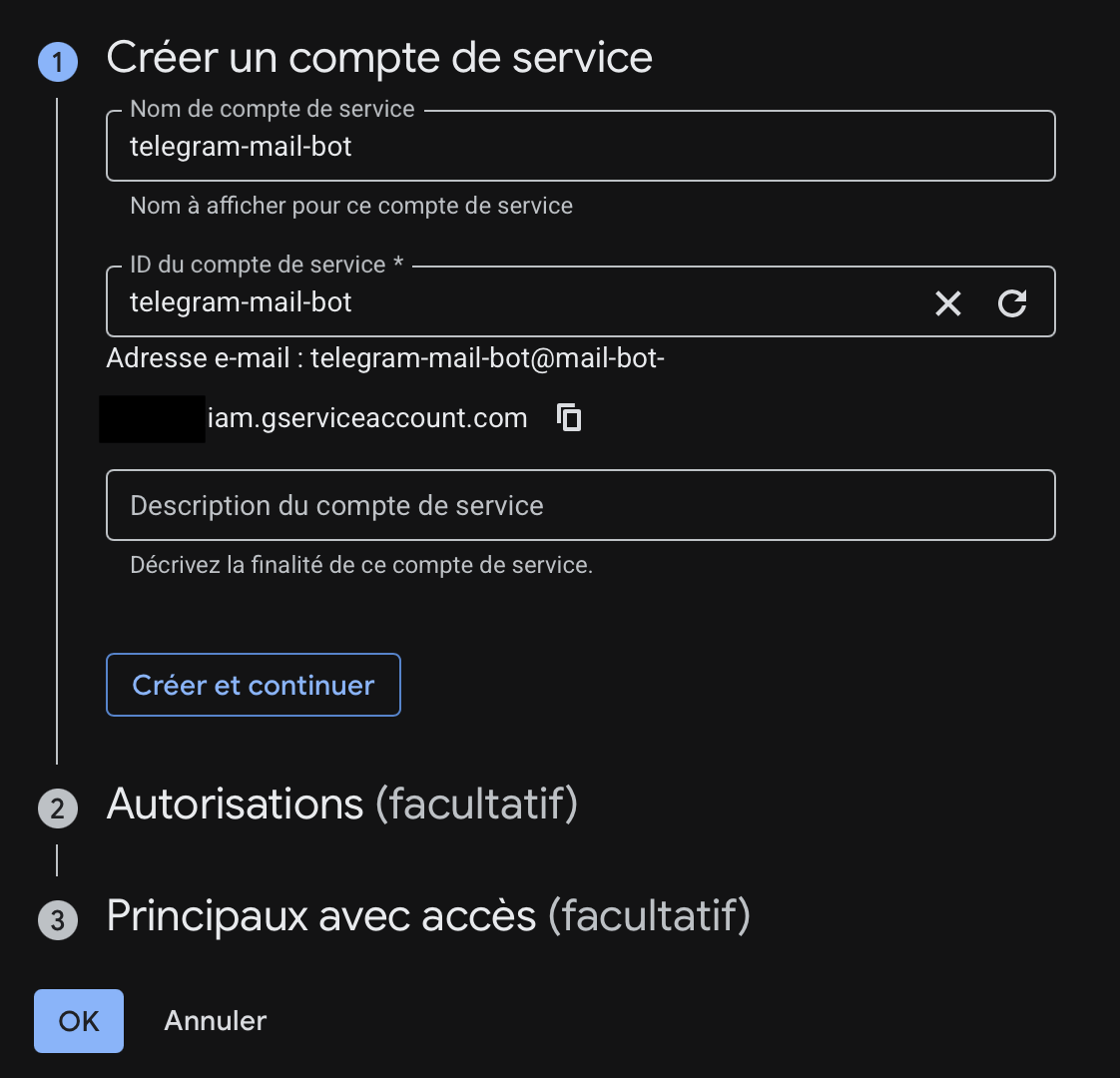 Give it a descriptive name. I used telegram-mail-bot. Google will automatically generate an email address for it (something like [email protected]). You don't need to grant it any IAM roles at this stage — just create it and move on to the next step.