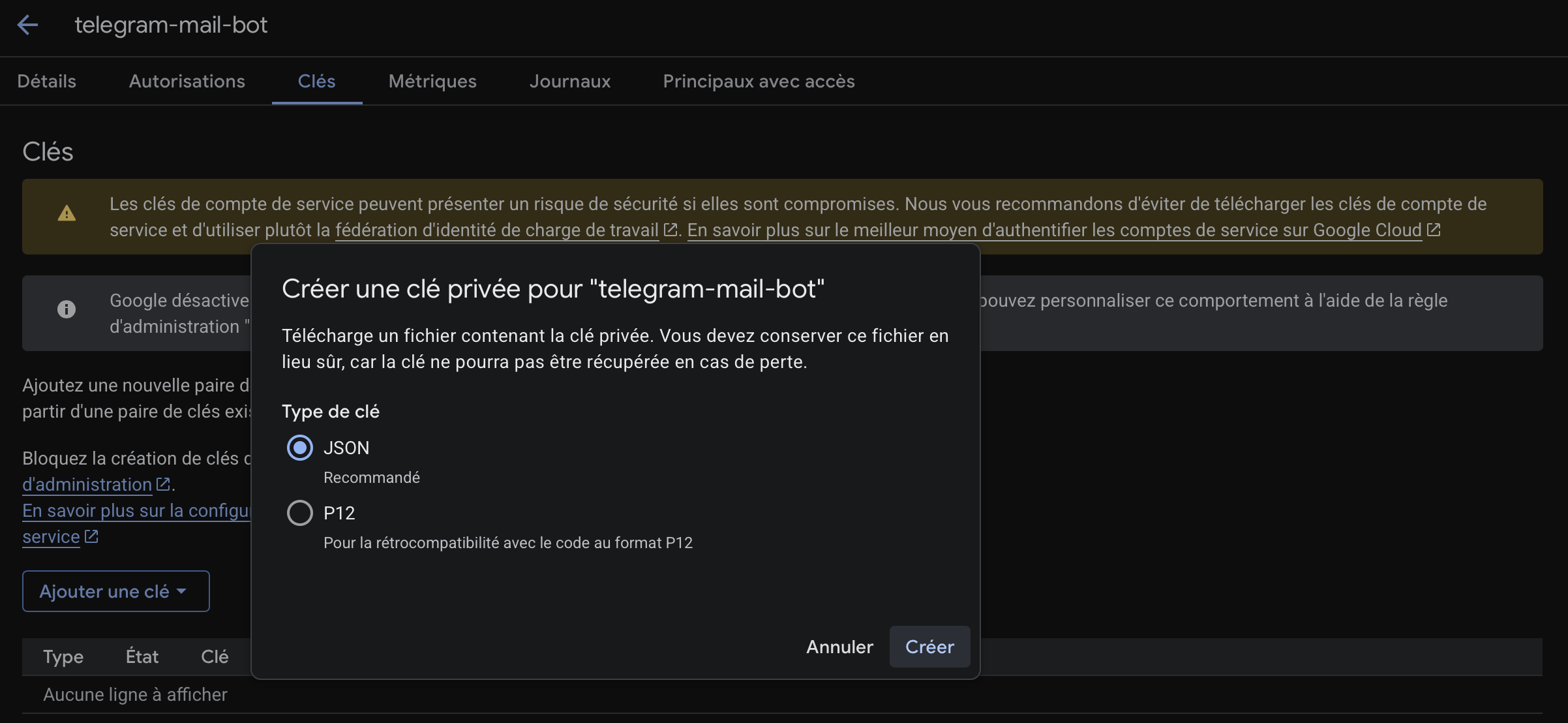 Once the service account is created, open it and go to the Keys tab. Click Add Key → Create new key, select JSON, and download the file. This is the credential file the bot will use to authenticate with Google — treat it like a password.