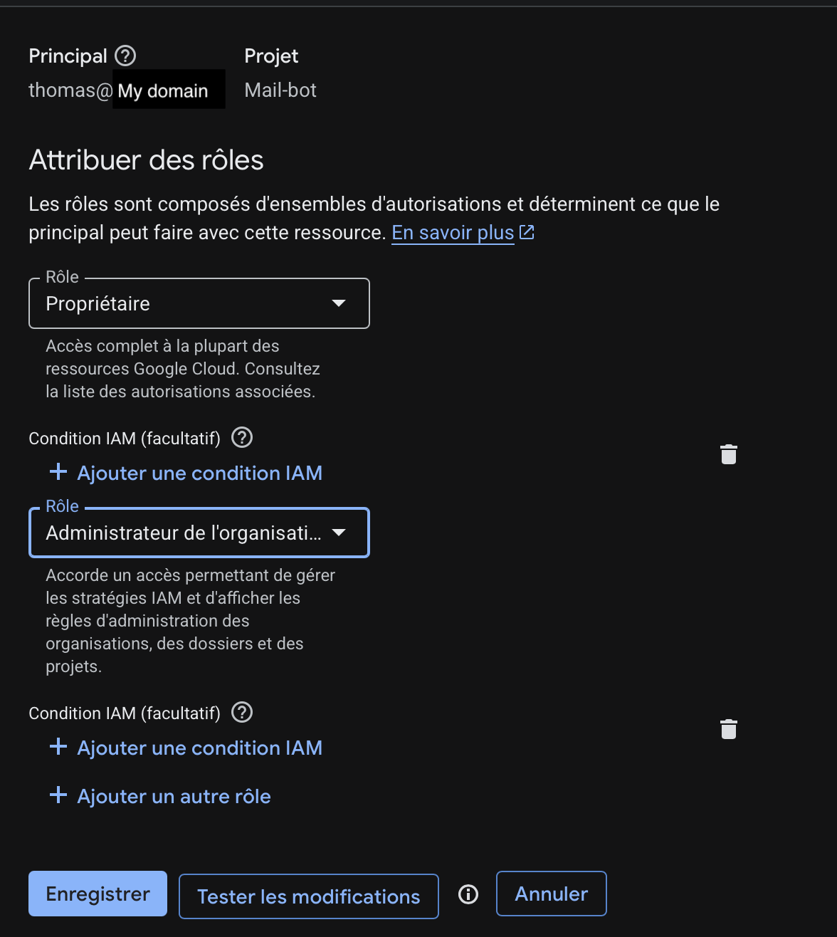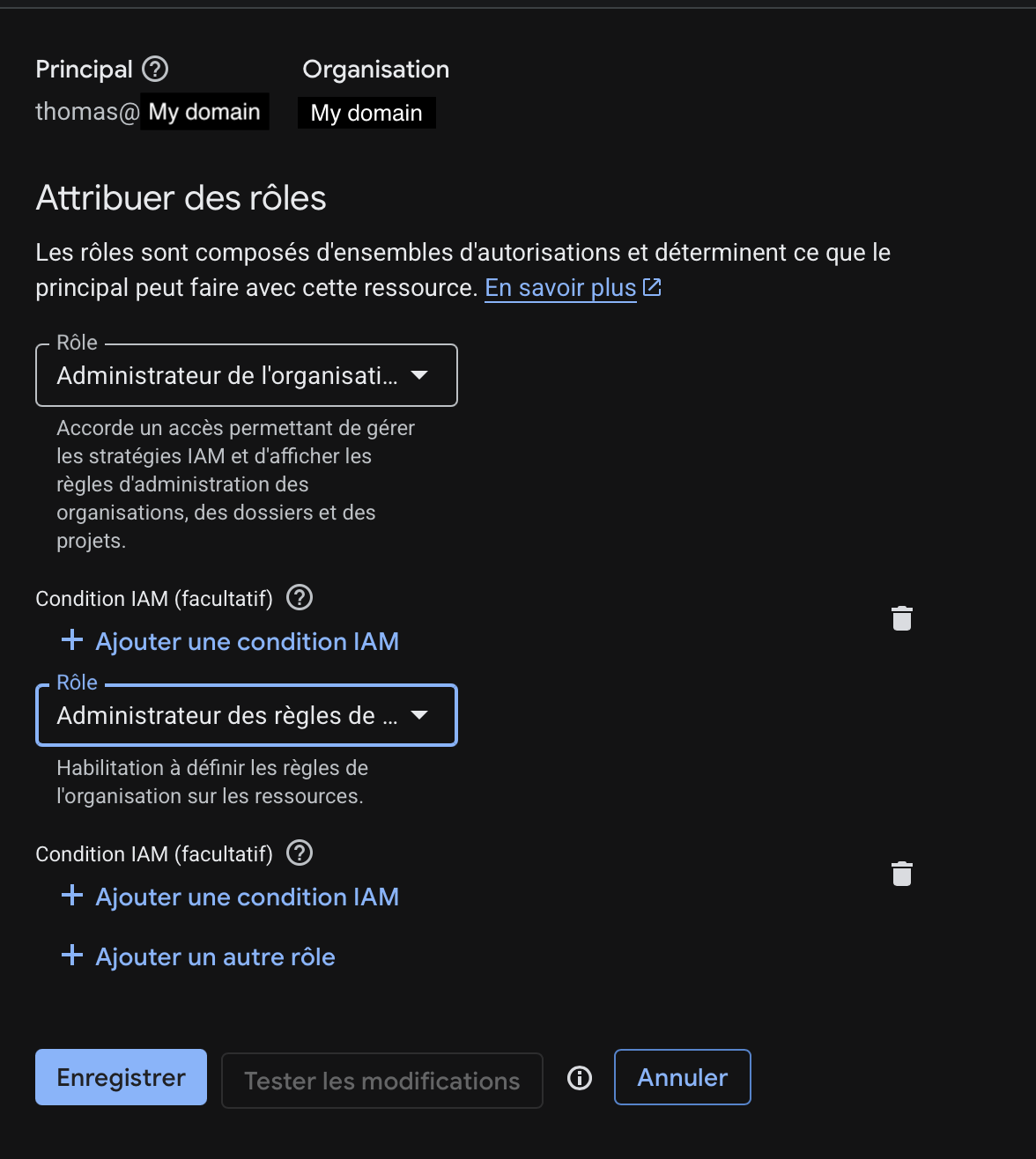 To do this, select your organization in the project picker, click More actions (the 3 dots) → IAM, and edit your user to add two roles: Organization Policy Administrator and Organization Administrator. Make sure you're at the organization level, not the project level, otherwise the first role won't appear in the list.