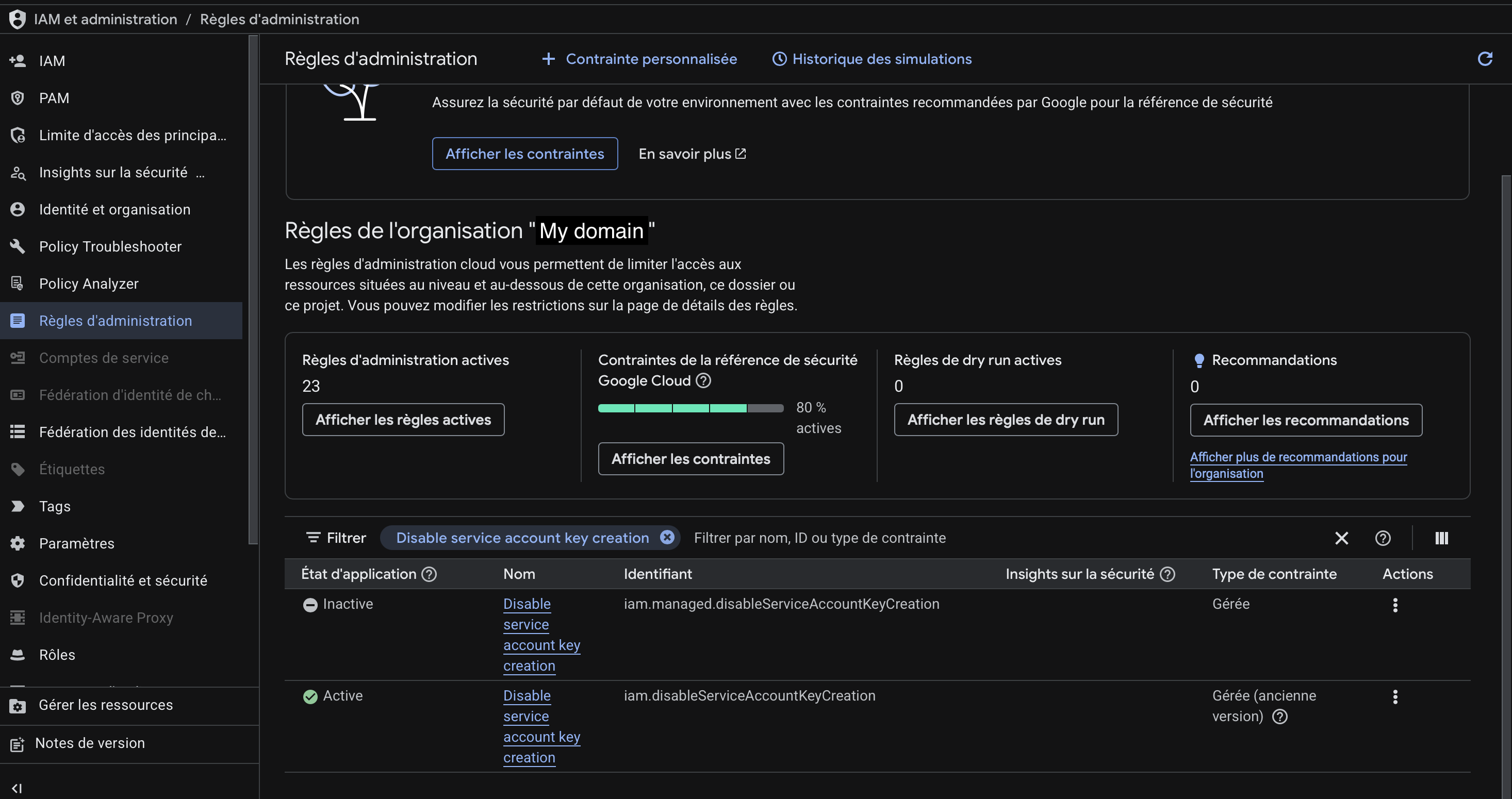 Once saved, go to IAM & Admin → Organization Policies, search for "Disable service account key creation", and disable the constraint.