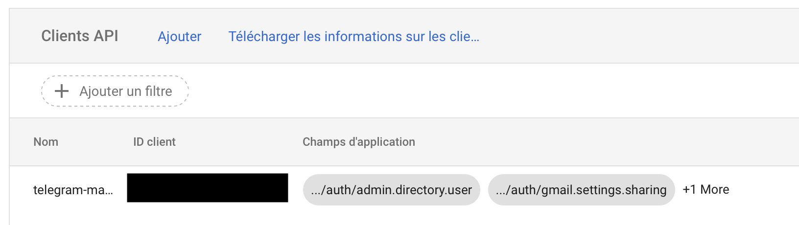 https://www.googleapis.com/auth/gmail.settings.basicOnce saved, the service account will appear in the list with its authorized scopes.