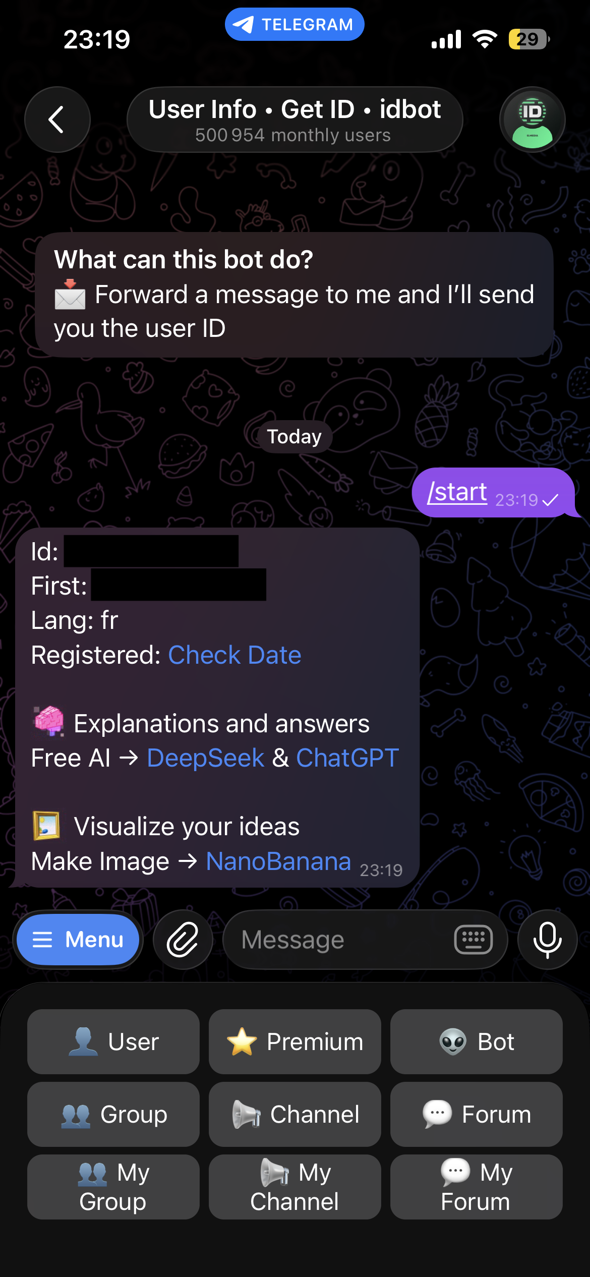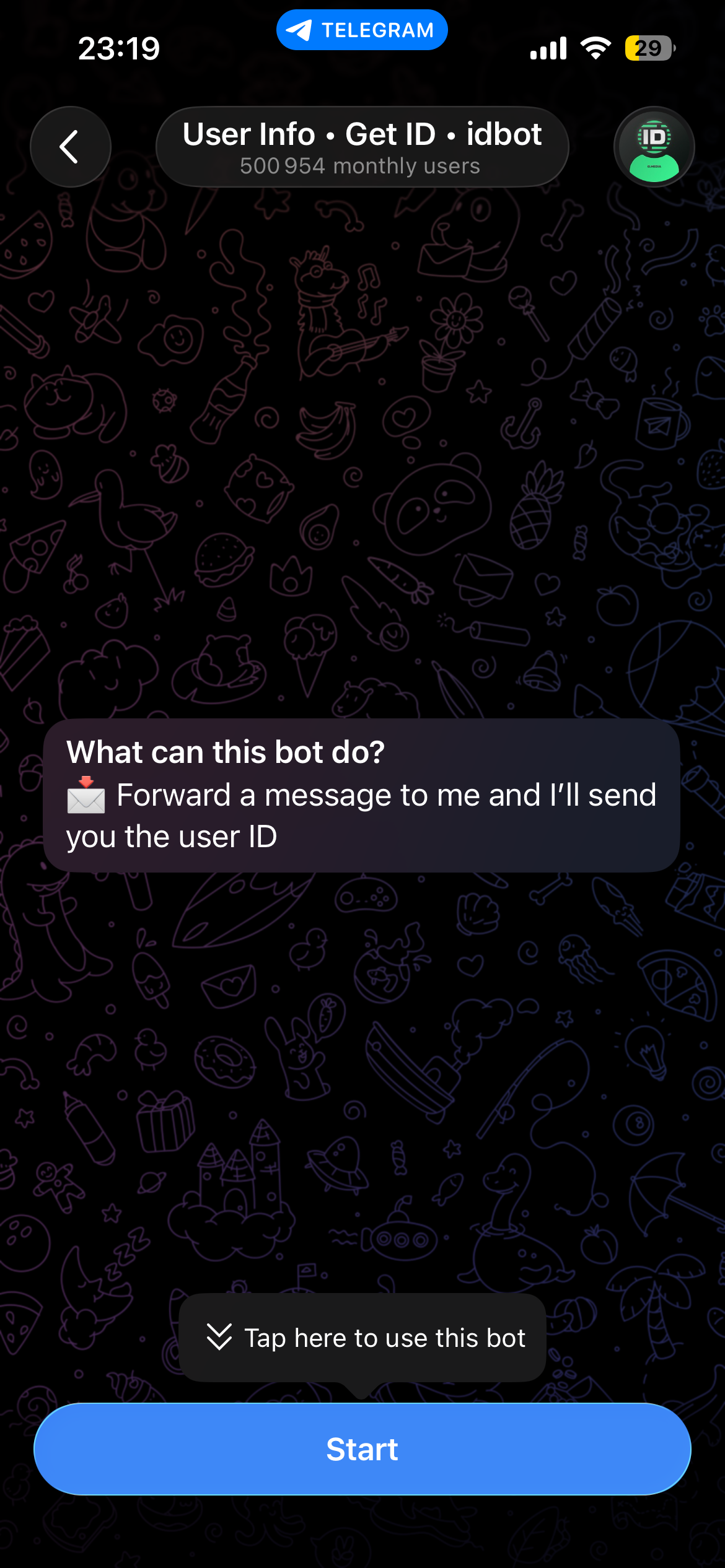 Before creating the bot, you need your personal Telegram user ID. This is what restricts the bot to only respond to you. Open @userinfobot and tap Start — it will immediately send back your ID.