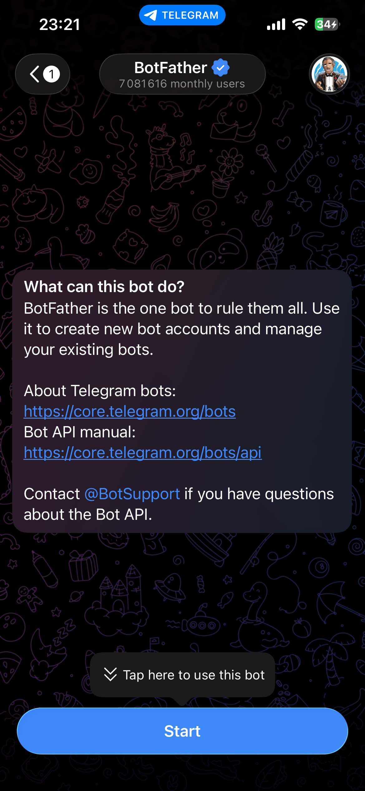 Open @BotFather — the official Telegram bot for managing bots.