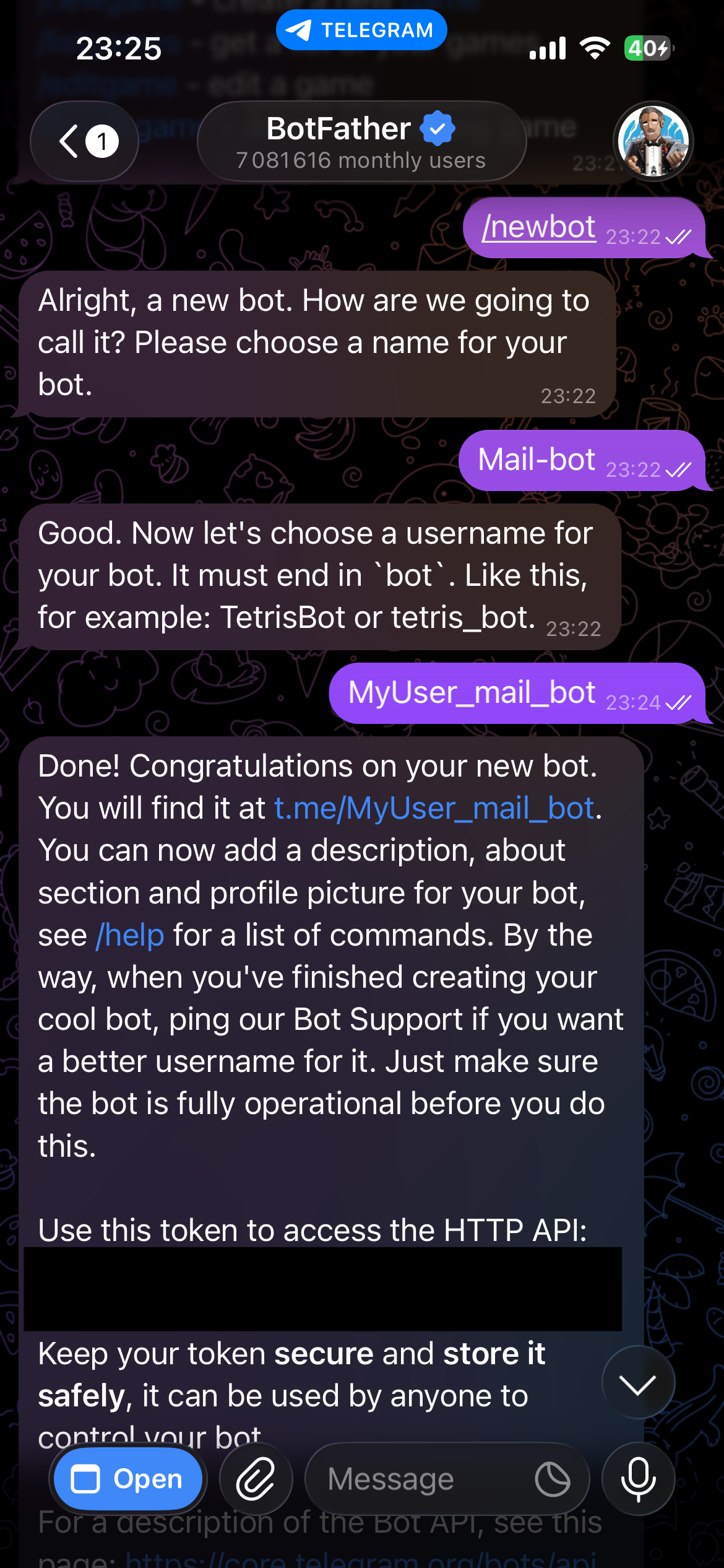 Send /newbot, choose a name and a username (must end in bot), and BotFather will give you the HTTP API token. Store it in your .env file as TELEGRAM_BOT_TOKEN, and keep it secure, anyone with this token can send messages and commands as your bot.