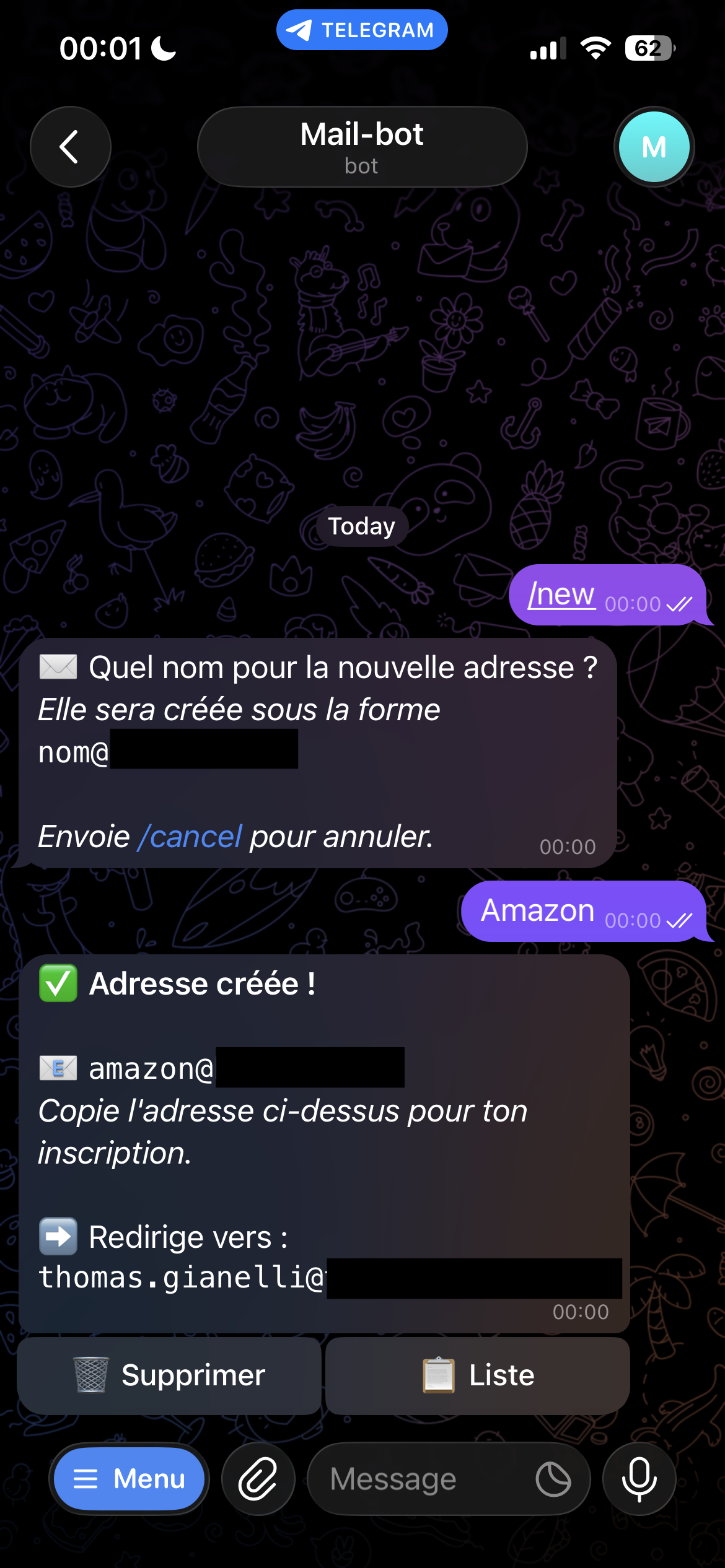 One Telegram message. Done. And since every service gets its own address, I always know exactly who leaked or sold my data.